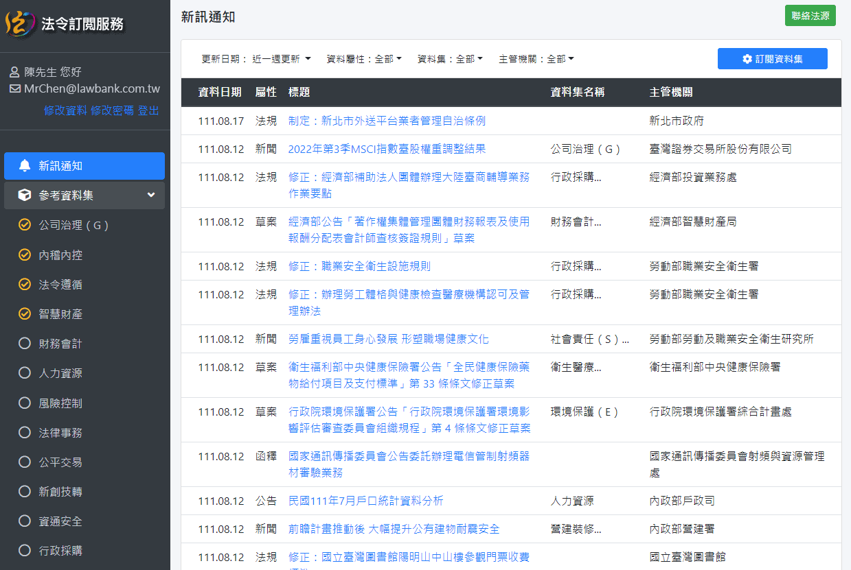 依據需求自主訂閱法令規章、行政函釋、法規草案…等法學資料;每日提供異動通知。